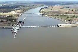 The lock and dam were constructed by the Corps of Engineers. Prior to starting construction in 1963, the project was identified as Short Mountain Lock and Dam, but was renamed in honor of the late Oklahoma Senator, who had spent much of his political career pushing for the Arkansas River to be made navigable.[1] The project was completed in 1970 at a cost of $94.566 million ($501 million in 2007 dollars).[2] The dam also contains a small hydroelectric power plant with four units capable of producing a combined total of 110 megawatts.
