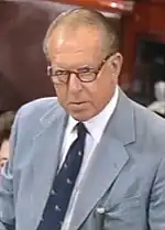 In his later years, Stafford was regarded as the elder statesman of Vermont Republicans.[20] In 1998, Jack McMullen, a recent arrival to Vermont, declared his candidacy for the Republican nomination for U.S. Senator.[21] As related by Chris Graff, longtime Vermont bureau chief for the Associated Press, McMullen's candidacy sustained an immediate blow when Graff interviewed Stafford about the January 1998 ice storm and other current events.[22] During the discussion, Stafford persistently got McMullen's name wrong, calling him "Mulholland".[22] Graff wrote that he tried to politely correct Stafford, but finally realized that Stafford's intent was to convey his opinion that McMullen was too unknown and too new to Vermont to be a viable candidate.[22] The lede in the resulting story was that Vermont's senior Republican was of the view that McMullen had not lived in the state long enough to represent it in the senate, and Stafford's dismissal of McMullen as "Mulholland or whatever his name is" became a running joke among reporters and political operatives.[22]