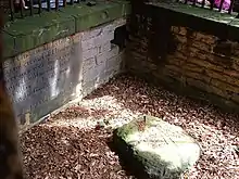 In Philemon Holland's English translation of William Camden's Britannia (1607), "the tombe of Robin Hood" is mentioned in passing as situated near Kirklees Priory.[12] A sketch made by Nathaniel Johnston in 1665 shows a stone bearing the same inscription as that described by Grafton.[8] In the early 1700s, Ralph Thoresby wrote that he had seen the stone, but the inscription was barely legible.[7] Richard Gough, in 1786, wrote that the stone marking the grave was "broken and much defaced, the inscription illegible". He reports that a former landowner had excavated the spot, and found that the earth below the stone had never been disturbed.[13] Gough's illustration of this stone does not match up with the description provided by Grafton.[7]