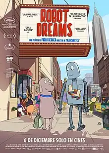 Robot Dreams is a 2023 Spanish-French animated tragicomedy[4] film written and directed by Pablo Berger.[5] It is based on the comic of the same name by Sara Varon.[6] It is about the inseparable friendship between a dog and a robot in Manhattan, New York in the 1980s.[7]