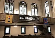 During the summer of 2020, First Universalist congregation members supported local Black Lives Matter protests both before and after the news of Daniel Prude's death at the hands of the Rochester Police Department was made public.[2] Initially they hosted a table of supplies and made the church restroom available. As the protests lasted into the fall of 2020, First Universalist began hosting the Rochester Street Medic Collective.
