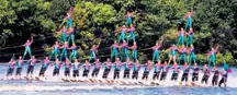 The club was the first amateur team to build the three-high pyramid (1974), the four-high pyramid (1981), and the five-high pyramid (1993).[4][1][5] They hold the record for the largest pyramid in competition: 44 people (2003).[1] They were the first amateur American ski team to perform in the People's Republic of China, in 1999.[1][6] In 2012, in collaboration with the Chinese Water Ski Team, the Aqua Jays set a Guinness World Record for the number of humans to water ski in a pyramid: 55.[7] They have won the national show ski tournament a record 19 times, and placed second in the event 12 times. The Aqua Jays have also won the Wisconsin State Show Tournament a record 15 times. They have taken the triple crown of show skiing 11 times,[1] and were named the National Show Ski Association Team of the Year 6 times.[8]