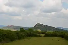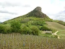 The Rock of Solutré (French: Roche de Solutré) is a limestone escarpment 8 km (5.0 mi) west of Mâcon, France, overlooking the commune of Solutré-Pouilly. It is an iconic site in the department of Saône-et-Loire, in Bourgogne-Franche-Comté.