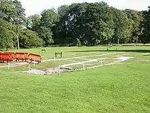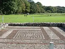 Rockbourne Roman villa is located at West Park,[2] near the village of Rockbourne in Hampshire.[3] It is 5 km northwest of the town of Fordingbridge.[2] The villa once stood in the centre of a large farming estate, and is the largest known villa in the area.[3] The villa was discovered in 1942 by a farmer digging out a ferret, and finding quantities of oyster shells and subsequently a mosaic floor.[4] Recognising the significance of the finds, the land was bought by A. T. Morley Hewitt who conducted excavations every summer from 1956 to 1978.[5]