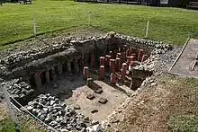 Around 150 the small house was demolished for a larger building.[11] The new house was a larger row-house consisting of an important middle room with smaller rooms to the north and south of it.[10] The house was aligned with the older work-hall, but kept apart from it.[10] This was the beginning of the west wing. Later in the century a small bath suite was added to this west house.[9] The most unusual feature of this west bath suite is that the pilae in the underfloor hypocaust heating system were built from curved roof tiles (imbrices) rather than from stacks of bricks.[11][12]