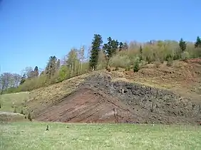 The photograph of the longitudinally section rim of the crater shows this succession. The reddish strata sloping to the left are the depositions of lapilli. On their right flank follow, first of all, a thin layer of ejected material (tuff) and then the thicker, black layer of scoria.[2]