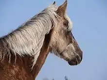 Rocky Mountain Horses stand between 14 and 16 hands (56 and 64 inches, 142 and 163 cm) high. Any solid color is accepted by the registry, but a dark brown color called "chocolate" with a pale, "flaxen" mane and tail is preferred.[1] This coloration is the result of the relatively rare silver dapple gene acting on a black base coat. Although uncommon, this gene has been found in over a dozen breeds, including the Rocky Mountain Horse.[2] Minimal white markings are accepted by the registry, although leg markings may not extend above the knee. The physical characteristics are somewhat variable, due to the disparate breeds that created the Rocky Mountain Horse.[1] The Rocky Mountain Horse is known by enthusiasts for its hardiness and ability to withstand winters in the mountains.[3] It is also praised for its good nature and affinity for humans.[4]