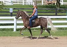 The breed exhibits a natural ambling gait, called the single-foot,[7] which replaces the trot seen in a majority of horse breeds.[1] Both gaits are an intermediate speed between a walk and a canter or gallop; ambling gaits are four-beat gaits, whereas the trot is a two-beat gait. The extra footfalls provide additional smoothness to a rider because the horse always has at least one foot on the ground. This minimizes movement of the horse's topline and removes the bounce of a two-beat gait, caused by a moment of suspension followed by the jolt of two feet hitting the ground as the horse shifts from one pair of legs to the other.[8] The value of an intermediate speed is that the horse conserves energy.[9] More than thirty horse breeds are "gaited," able to perform a four-beat ambling gait, and some can also trot.[8] Thus, a Rocky Mountain Horse, with rider, can use the single-foot to cover rough ground at around 7 miles per hour (11 km/h) and short stretches of smooth ground at up to 16 miles per hour (26 km/h).[3] The faster speed is known as the rack.[7] In comparison, the average medium trot speed is 6 to 8 miles per hour (9.7 to 12.9 km/h).[10]