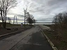 Rocky Point is a passive use area, with most of the former amusement park now open space.[13] A few structures from the amusement park remain, including the circa 1906 Circle Swing ride tower; the upper and lower stations and support towers from the Skyliner gondola ride; ruins of an old water tank; and a large arch by the entrance.[14][15] The arch, which was originally one of 11 “Peace Through Understanding” arches for the 1964-65 World's Fair in Flushing, Queens, New York, was subsequently moved to Rocky Point in 1966, and underwent restoration in 2016.[16][17][18][19] In the summer the park screens movies on its lawn and hosts a 5K run.[20][21] In 2017 and 2018, the state park hosted Food Truck Nights. A large public fishing pier was opened in July 2020.[22] It is the only true deep-water fishing pier in the bay.[23]