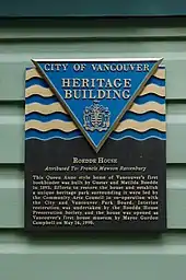 Heritage building plaque on Roedde House. Roedde House was named a Class-A Heritage Building in 1970 by the City of Vancouver.