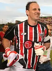 Rogério Mücke Ceni (Brazilian Portuguese: [ʁoˈʒɛɾiu ˈsẽni]; born 22 January 1973) is a Brazilian professional football coach and former player who is in charge of Bahia. He is considered one of the all-time greatest Brazilian goalkeepers[3] and is recognised by the International Federation of Football History & Statistics as the goalkeeper to have scored the most goals in the history of football.[4][5] During the height of his career (2005–2008) he was also recognized as one of the best goalkeepers in the world.[6][7]