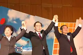He served as a member of the National Assembly from 2004 to 2008.[6] He co-founded the New Progressive Party with Sim Sang-jung, Cho Seungsoo, and other members of the People's Democracy faction of the Democratic Labor Party.[7] He unsuccessfully ran for Mayor of Seoul as a New Progressive Party candidate in 2010.[8] He again served as a member of the National Assembly on behalf of the Unified Progressive Party and the Justice Party in 2012 to 2013.[9] Roh broke with the Unified Progressive Party after allegations that the faction led by the party leader Lee Jung-hee had manipulated the party list to elect members of her own faction into the National Assembly.[10] He, with Sim Sang-jeong and Rhyu Si-min, formed the Progressive Justice Party in October 2012, but in 2013 it became the Justice Party.[11][2]