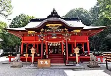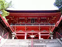 The honden, haiden, heiden (votive offerings hall), rōmon and shingusho (offering preparation hall) are all protected as Important Cultural Properties.[1] Today the shrine enjoys a popularity with women praying for an easy childbirth.