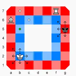 The kings move the same as kings in chess: one step in any direction. The bishop can move forward diagonally to white dots (including one rebound off b7), or one step diagonally backward (green dot). The rook is in a very powerful position in the diagram; without assistance, it has the black king in checkmate.