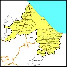 The Diocese of Rimini (Latin: Dioecesis Ariminensis) is a Latin Church ecclesiastical territory or diocese of the Catholic Church in Emilia Romagna, Italy. From earliest times, it was a suffragan to the Holy See, despite repeated attempts by the Diocese of Ravenna to claim it as a suffragan diocese.[1] Since 1604, however, it has been a suffragan of the Archdiocese of Ravenna-Cervia.[2][3]