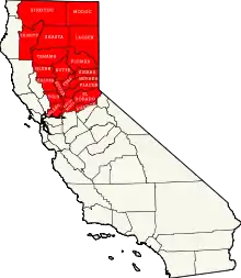 Siskiyou, Modoc, Trinity, Shasta, Lassen, Tehama, Plumas, Glenn, Butte, Sierra, Colusa, Sutter, Yuba, Nevada, Yolo, Placer, Solano, Sacramento, El Dorado, and Amador.