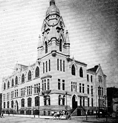 Dedicated on September 6, 1890, the school's original main building established the main entrance on the frontage of North Broad Street. The building's length was 140 feet and extended eastward on Vine Street for 115 feet, bordered on the north by the very narrow Pearl Street and bounded eastward by a ten-foot wide alley commonly known as Watts Street, rededicated to the school. The land was formerly a Railroad Depot moved just north to Cahowhill Street. The exterior is a three-story building of Victorian Gothic design, faced with "Lee, Massachusetts" marble (the same as selected for Philadelphia City Hall), placed on a granite base (quarried from Conshohocken, Pennsylvania) and sited to impact majestically at the intersection by prominent architect Edwin Forrest Durang. The building has two ornamental stone facades along Vine and Broad Streets joined at a square corner tower and two brick facades at the rear of the building. The building originally had a 150-foot marble tower topped in copper at the corner of Board and Vine, destroyed by fire in 1959 and not replaced.