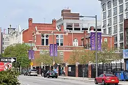 View east side of Roman Catholic High School. Roman's 1953 and 1997 additions are visible in the foreground, showing the contrast between the red brick facades and the marble facade of the original 1890 building.