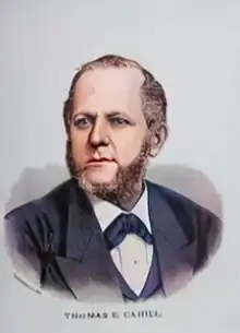Thomas E. Cahill, born May 27, 1828, was the son of Thomas Cahill, a native of County Louth in Ireland, colloquially known as 'the Wee County' who came to America in 1817, and of Maria Elliott, daughter of one of the oldest colonial families of Delaware. His father was a railroad contractor who suffered heavy reverses in his business. His mother died at the age of 36. Thomas left school to do his share towards the support of a large family. At 17, he opened a small store in Philadelphia, located between Pine and Spruce Streets on 26th at a wharf on the Schuylkill River.