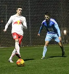 ![]() Roman Polom (right) looked on, as Smail Prevljak (left) passed the ball during a match between Mladá Boleslav and Red Bull Salzburg in 2016. | |||