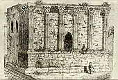 During the 14th century, the temple's space served as a stronghouse for the town's castle, while Fernão Lopes described the structure as being in shambles.[4] In 1467, King Afonso V of Portugal authorized Soeiro Mendes to remove stones from the structure for building purposes and defense.[4] The ruins of the temple were incorporated into a tower of the Castle of Évora during the Middle Ages. The base, columns and architraves of the temple were kept embedded in the walls of the medieval building; the temple-turned-tower was used as a butcher shop[5] from the 14th century until 1836; this new use of the temple structure helped preserve its remains from complete destruction.[4][6]