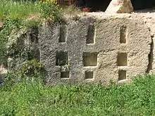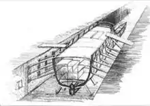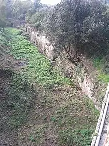 The remains are situated inside an artificial channel dug in the rock, about 280 m long, once united with the Nera River upstream and downstream, as showed by some maps of the land office. It is composed with two opposite cut walls, about 16.5 m apart, which showed a series of squared holes disposed on three lines, for a total of 30 incisions per wall, on the theoretical basis carried out by the artist who has reconstructed its scale drawing (there are only 27 holes still visible). The function of these holes has been supposed to be for inserting lateral props to support and stabilise ships. The fact the holes run for about 13 metres per wall, and considering how the props should not be necessary for prow and stern (the thinnest parts of the boat), the measures appear quite substantive for simple river rafts, especially with reference to the notable distance between walls. So far, it has seemed more prudent not to speak about Roman quinquereme or trireme without the essential comparisons, especially considering how the historians themselves are not agreed about the exact measures of these warships. However, most of them share similar opinions when they speak about their draft, supposed to be quite moderate,[9] then potentially suitable to descend along the last stretch of the Nera River, which is very copious of water before to flow into the Tiber River. The reasons of a shipyard quite far from the Tyrrhenian Sea, but however well linked with it through the river way, should be found on the abundance of raw material offered by the Umbrian territory (wood of different quality), with the area of Narni fall under the Roman domination since 299 BC. In add, it is interesting to ascertain how the classical authors of that period did not supply clear information about the different position of the navy yard, included Polybius who has been the most important historians of the Punic Wars. The need of safety could be linked with the choice to assemble ships in the up-country, without the risk to be exposed at the potential threats of the enemy from the sea. In fact, the modern historians are in agreement to collocate the ancient navalia inside the city of Rome, in the area of Campus Martius.[10] It means the shipyard of Stifone could be only one of the different structures used at that époque, in whom the imposing effort made by the Romans in the year 261 BC to create their first war fleet is famous. However, it is right and proper to insist how the hypothesis, although generally shared by the researchers, are at the moment still under assessment.