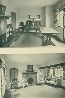 The interiors were designed to make domestic living as economic as possible. There was much tiling throughout, especially in the kitchen and scullery, where surfaces could be cleaned easily. Some of the dwellings were furnished by the architect, and others by leading companies of the day, including Heal & Son who were based in Tottenham Court Road.[31] The construction of each house was either funded solely by the architect or in partnership with the builder.[32]