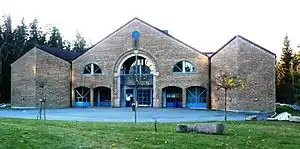 Romsås Church (Romsås kirke) is a 220-seat brick church designed in a postmodern style by architect Arne E. Sæther, with an altarpiece by Nina Sundbye. It was built on the ruins of an earlier wooden structure which burned down in 1986, and was inaugurated in 1995. As the site was formerly a landfill, the church has suffered significant subsidence damage since its construction.[4][5]