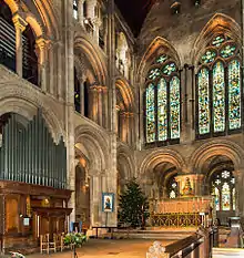 Romsey Abbey has two organs. The main instrument was built by J W Walker & Sons in 1858 and replaced an earlier instrument by Henry Coster. The Walker Organ was rebuilt in its present position and enlarged in 1888. Major restoration work was carried out by J. W. Walker & Sons Ltd in 1995/96 under the supervision of the abbey's organist, Jeffrey Williams, restoring the mechanical actions and overhauling all of the pipe work. In 1999 a completely new nave organ by Walkers was constructed with its pipe work located on the south triforium. This can be played either from a mobile console in the nave or from the main console.[12]