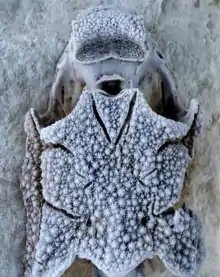 The skull of Romundina consists of thin proportional dermal bones, which are heavily ornamented by mesodentine rich stellate (star shaped) tubercles. These stellate tubercles likely grew on top of each other with between two and three generations.[2] Furthermore, these tubercles exhibit rough ridges radiation from an apex, which is in contrast to other species, which had smooth ridged stellate tubercles such as Radotina. These stellate tubercles were likely used as a form of protection from predators[2] Additionally, Romundina stellina only has one dermal cheek element (suborbital plate) while most other species of Placoderms such as Radotina have multiple dermal cheek elements. This suggests that Romundina lost the submarginal plates and postsuborbital seen in earlier vertebrates. An additional feature that distinguishes Romundina from previous Placoderms is the absence of tesserae (a type of mineralized tile) between the dermal bones on the roof of the skull as the dermal bones in the roof of Romundina's skull are fused together.[2]
