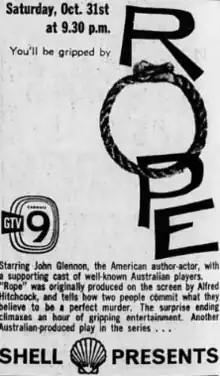 "Rope" is a 1959 Australian TV play based on the play by Patrick Hamilton. It was part of Shell Presents.[1] It aired on 31 October 1959 in Melbourne,[2] and a tapped version aired on 15 November 1959 in Sydney.