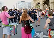 RAW tries to drown a small counter-demonstration of Christian fundamentalists (hidden by police) at the CSD parade 2012 using bowls and whistles