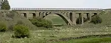 The Rosalia Railroad Bridge was built by the Chicago, Milwaukee, St. Paul and Pacific Railroad (also known as the Milwaukee Road) in 1915 to replace an earlier timber trestle. The bridge was designed as a concrete arch, unusual for a railroad bridge, because it crosses the Northern Pacific Railroad tracks (a rival railroad), a state highway, and is visible from Steptoe Battlefield State Park. The railroad wanted an impressive-looking bridge.[1] The viaduct consists of two spans, separated by an embankment. East of the 334-foot (102 m) embankment there is a 114-foot (35 m) span crossing over the Northern Pacific tracks. To the west is a 502-foot (153 m) span that crosses Pine Creek, railroad tracks, and the highway.