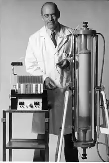 Dr. Brady developed the first enzyme replacement therapy for Gaucher Disease, which has become a model for treatments of other inherited enzymatic diseases. Here he is standing next to a column chromatograph.