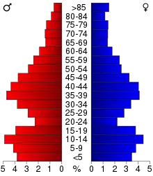 The county population contained 29.80% under the age of 18, 6.80% from 18 to 24, 29.90% from 25 to 44, 20.80% from 45 to 64, and 12.60% who were 65 years of age or older. The median age was 35 years. For every 100 females there were 105.00 males. For every 100 females age 18 and over, there were 104.00 males.