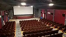 The RTC secured a new retractable screen by October 2010, from a New Windsor–based entertainment supplier, to replace the fixed screen that had obscured access to the Theatre's 15-foot (4.6 m) stage.[42] The new screen opened the stage by 20 feet (6.1 m), allowing live acts.[43] Under the Cacchios, the screen had been replaced once a decade, with an engineer performing maintenance once every six months.[6] Eight Behringer stereo surround sound speakers and two subwoofers were installed in the building in December 2010.[44] By February 2011, the RTC also added a digital projector, a stage thrust, a server for digital programming, and a new phone system. The group announced plans to add a concession stand, an additional server, and an uninterruptible power supply. The group also intended to move the ticket booth outside during warm months.[43]