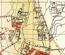 Map from 1887 showing watercourses dividing the areas of Kristiania into districts in 1878. Along the south, Dælenenga is being built.