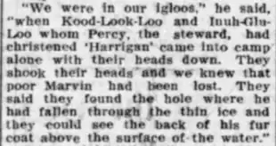 Marvin was originally believed to have drowned, as Kudlookto reported that Marvin's body was discovered after he fell through thin ice.[2] Peary subsequently sent a telegram to Elmira reporting, "Drowned April 10, 1909 45 mile north of Cape Columbia while returning from 86 degrees 38 minutes North Latitude."[1][11] However, Kudlookto stated in 1926 that he had shot and killed Marvin, either because Marvin had started acting irrationally,[1] or because Marvin refused to let Kudlookto's cousin rest[2]—sources differ. In 1954, Peary’s daughter stated that she believed Marvin drowned, and discounted Kudlookto's story.[1]