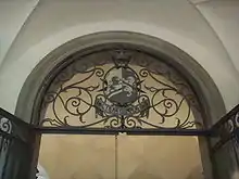 The crest with the two lions of the Rosselli del Turco, with the family motto in medio virtus, Palazzo Borgherini-Rosselli del Turco