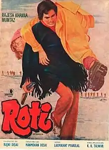 Roti (transl. Chappati or Flatbread) is a 1974 Indian Hindi-language action film, produced by Rajni Desai and Rajesh Khanna under the banner Aashirwad Pictures Pvt. Ltd and directed by Manmohan Desai. It stars Rajesh Khanna and Mumtaz, with music composed by Laxmikant Pyarelal. This film was released on 18 October 1974, along with Benaam and Roti Kapda Aur Makaan.[1] Kader Khan was reportedly paid ₹1.21 lakhs for writing dialogues for the film.[2] The film was remade in Telugu as Neram Nadi Kadu Akalidi, starring N.T. Rama Rao and Manjula.