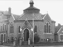 Built with red brick and slate roof on the corner of Victoria Road and Albert Road for the Primitive Methodists in Aldershot,[9][10] construction began in 1874 and completed in 1876. Built on land obtained from benefactor Richard Allden, a local contractor who supplied hay for army horses, the £16,500 for its construction was raised by voluntary subscription and donations. The architect was Farnham-based Thomas Wonnacott, who chose an octagonal design familiar to Methodists.[11] The construction was undertaken by local builder George Kemp.[12]