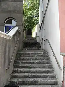 Despite this intensive building work, there were many gaps between houses and streets, and smallholdings and plant nurseries were common. Two existed in 1838, including one where grapes were cultivated, and more were planted in the 1850s. When the houses of Prince's Road were laid out, there were already two nurseries on it.[55] A large nursery existed behind Park Crescent until 1883, when the Salvation Army Citadel was built on the site.[55] Other areas of green space survive behind Richmond Road, between Wakefield Road and Roundhill Crescent, and along the railway embankment east of Ditchling Road tunnel.[56] Clearly visible from afar, these green spaces give the area a strong visual character and are important wildlife habitats.[12] Another characteristic topographical feature of Round Hill is the "cat's-creep", a type of steep, narrow staircase between buildings. Often found in Brighton's hilly suburbs such as Moulsecoomb and Hollingbury, the best example is found between Roundhill Crescent and Richmond Road.[57] Named Lennox Place,[57] it was planned at the same time as the nearby Mayo, D'Aubigny and Wakefield Roads, and was meant to be a proper street with houses. It was found to be too steep for horses and carts to negotiate, though,[54] and it was laid out as a footpath with eight steep flights of 15 steps instead.[57] It was a popular play area as well as a short-cut.[58]