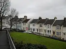 The area's character derives from its "tight urban form" and lack of 20th-century redevelopment, resulting in a homogeneous streetscape of mostly residential buildings in long terraces;[12] its steeply sloping land; and the swathes of trees and gardens which can be seen in long views into the area, which help to "define the unaltered Victorian streetplan" when seen from a distance.[12] Roundhill Crescent "both curves and changes height dramatically along its length". The houses, which on the northwest side of the road are not a continuous terrace and which date from the 1860s to the 1880s,[20] vary in height and the extent of their architectural detailing; canted bay windows and original cast-iron balconies feature prominently.[12][110] Some pairs of semi-detached villas of the 1860s survive on Richmond Road.[12] Prince's Road, where the 223-foot (68 m) summit of Round Hill is located, has a long, well-defined frontage of rendered terraced houses dating from the 1880s, with an older flint and brick house with decorative bargeboards and gables breaking up the composition.[111]