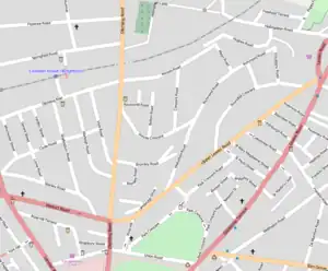 Round Hill is an approximately triangular area directly north of Brighton city centre.[6][2] The name is now applied to a wider area than the 223-foot (68 m) hill at its centre;[7] its boundaries are now defined as Union Road and The Level (a large area of open ground) to the south, the main London Road to the west, the East Coastway railway line to the north—including the London Road viaduct and London Road railway station—and the Lewes Road to the east. Ditchling Road, a third main road, runs through the centre of the suburb.[8][9] The large, round-topped hill which gave the suburb its name stands between the two main valleys along which the original routes into and out of Brighton developed (the present London and Lewes Roads). Ditchling Road, the middle route, climbs the hill. London and Lewes Roads became turnpikes (toll roads) in 1770, and The Level—originally common land between Ditchling Road and Lewes Road—was enclosed and reserved for public recreation in 1822.[10]