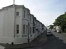 Contemporary housing developments included the southeast side of Upper Lewes Road, the west side of Lewes Road, and a series of impressive semi-detached villas on Ditchling Road,[8][20][23] but Round Hill's most intensive period of growth began in the mid-1860s.[20][43] "Fine curving terraces of Regency-style houses" appeared on the newly built Roundhill Crescent,[43] which curved away from the northwest side of Upper Lewes Road, and semi-detached houses were laid out on Richmond Road behind and at a higher level.[20] The first parts of Roundhill Crescent, still with a post-Regency character despite their late date,[51] were built in 1865.[23] Further development of the middle-class houses on these roads was patchy—many gaps still existed in 1875—[23] but lower-class terraced housing spread rapidly elsewhere. Vicar of Brighton Rev. Arthur Wagner bought the northern part of the former Pleasure Gardens—still open land in 1860—and stipulated that houses costing no more than £120 should be built for Brighton's working-class population. He lent money to builders to increase the pace of development.[3][20] The tightly packed terraced streets between Upper Lewes Road and Lewes Road were mostly complete by the 1870s, and St Martin's Church was built nearby to serve the area.[3][20] Larger individual houses of the 1860s included Prince's Villa, in an isolated position next to Tower Mill,[52] and Bryn—built in 1869 on Wakefield Road and used as an orphanage from 1875 until 1937.[53]
