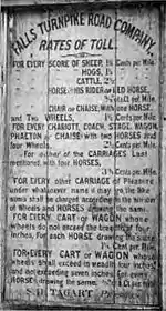 The description of allowed rates of toll given in the legislative charter are lengthy, and specify that, for instance, a horse and rider shall be charged 6.25 cents, and a two-horse stagecoach 25 cents, for the entire distance, and a smaller amount in proportion to the distance traveled.[7] Five miles were completed by 1811, allowing the company to erect a toll gate; a second gate had been placed by 1819. Due to the impossibility of determining how far a customer had traveled, the Baltimore County Court allowed the company to charge a full toll for passing over any part of the road.[19] The southern toll gate was located one to two blocks north of North Avenue at the bridge over Jones Falls,[20] and the other was several miles north, near Cross Keys.
