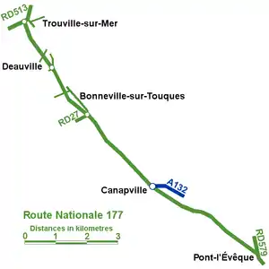 The road is bypassed by the A132 between Pont-l'Évêque and Canapville where the RN177 crosses several départementales and two level crossings. The section between the Bonneville-sur-Touques roundabout (where it meets the RD17 to Caen) and Deauville is a dual carriageway. The RN177 ends at a roundabout next to the gare de Trouville-Deauville where it meets the RD513.