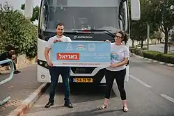 Schwartz Tichon and an activist in front of the bus that travels from Ariel to Tel Aviv