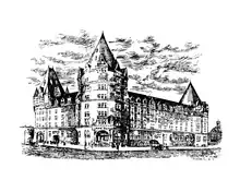 The Canadian Pacific began plans for a major hotel in Winnipeg in 1899. That year, president Thomas Shaughnessy unveiled plans for a combined station and hotel that was similar in concept to Place Viger in Montreal. The building was designed by Edward Maxwell and was drawn by David MacFarlane (later of Ross and MacFarlane), who was working in Maxwell's office at the time. The massing of the structure may have influenced MacFarlane's subsequent design of the Hotel Macdonald in Edmonton.[1] Maxwell preferred the building to be constructed of white stone and white brick, while company officials favoured red sandstone and Lac du Bonnet brick. The CPR's inability to acquire all the land necessary for the project prevented it from going forward.[2]