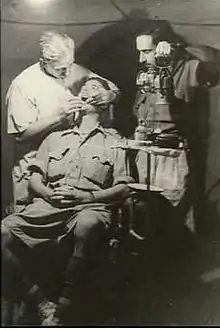 Later, as the Australian Imperial Force (AIF) was raised, a dental officer was recruited and situated in each military district with the remit of providing advice to senior medical personnel. They were not to carry out dental procedures, however, and as a result civilian dentists offered free services to soldiers while undertaking training in Australia.[4] Upon the AIF's arrival in Egypt in 1915, General William Throsby Bridges argued the case for dentists to be attached to the army in the field, stating that it would reduce the instances of soldiers having to be evacuated from the field as 'dental casualties'.[4] While some progress towards mitigating this was taken in January 1915 when the Australian Army Medical Corps (Dental) Reserve was approved, appointments were slow and consequently the AIF troops that deployed to Gallipoli did so without dental support. Dental health became a serious problem for the Australian army on the Gallipoli Peninsula, contributing as early as June 1915 to a significant number of medical evacuations from the front lines.[5] By July 1915, over 600 soldiers from the 1st Division alone had been evacuated as dental casualties.[6]